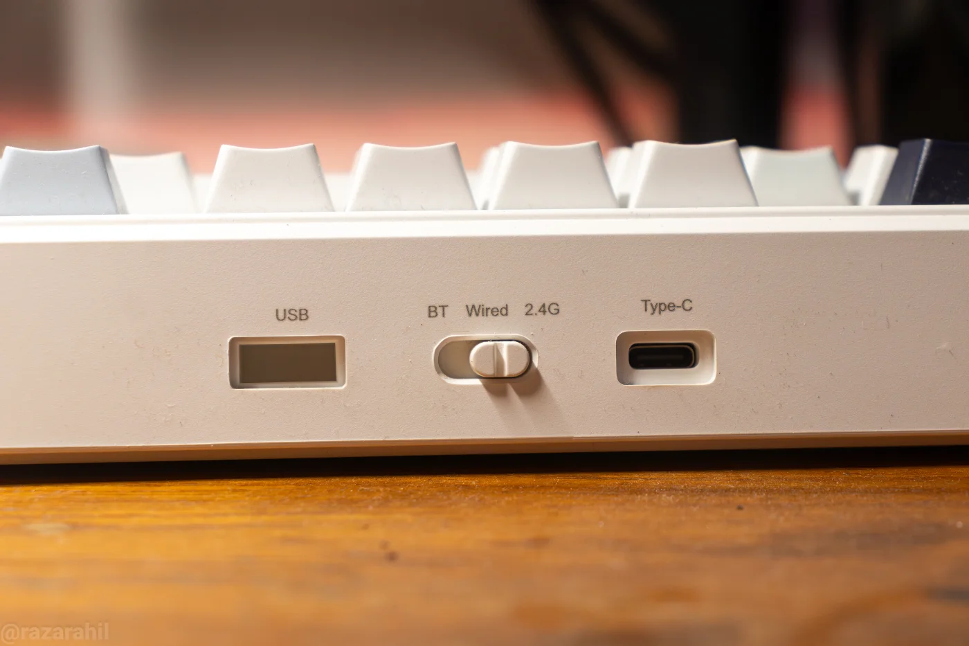 The chassis is constructed from ABS plastic, yet the overall build quality feels premium and substantial due to its weight. The Type-C port and the connectivity mode switch are positioned on the back of the keyboard.